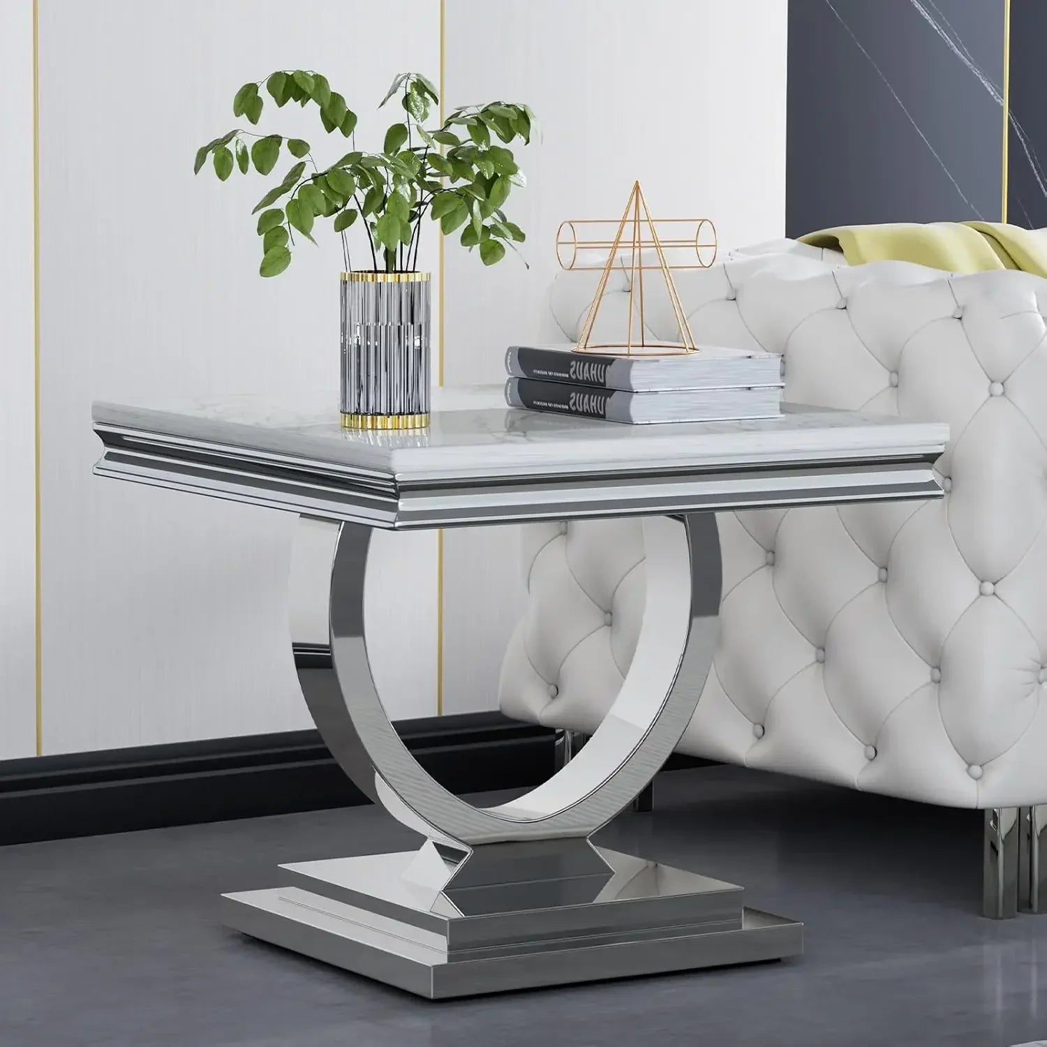 Enhance your living space with the stunning 47 Inch Rectangular Coffee Table, a modern masterpiece that combines elegance and functionality. This white faux marble cocktail table features a luxurious silver mirrored finish and a robust U shape stainless steel base, making it the perfect statement piece for any living room, office, shop, or bedroom.