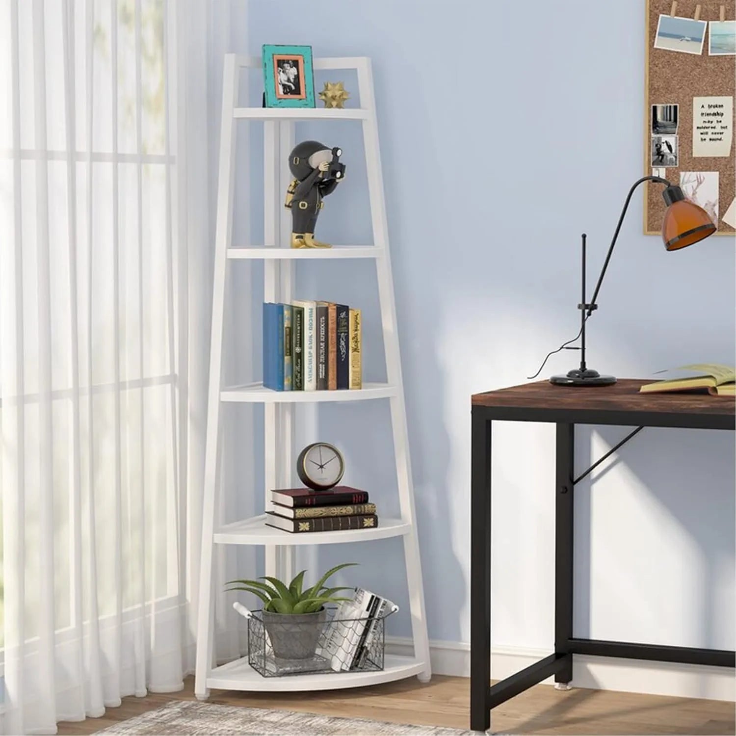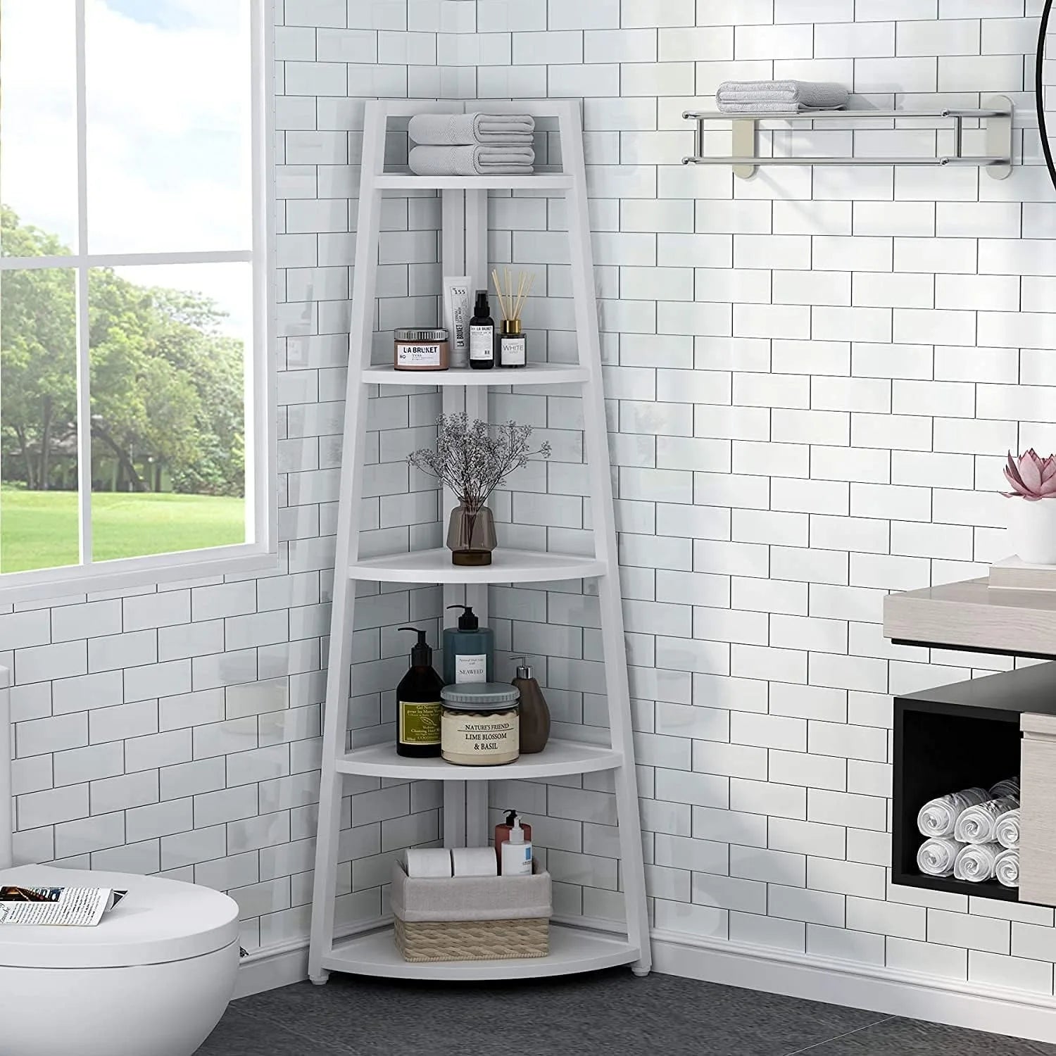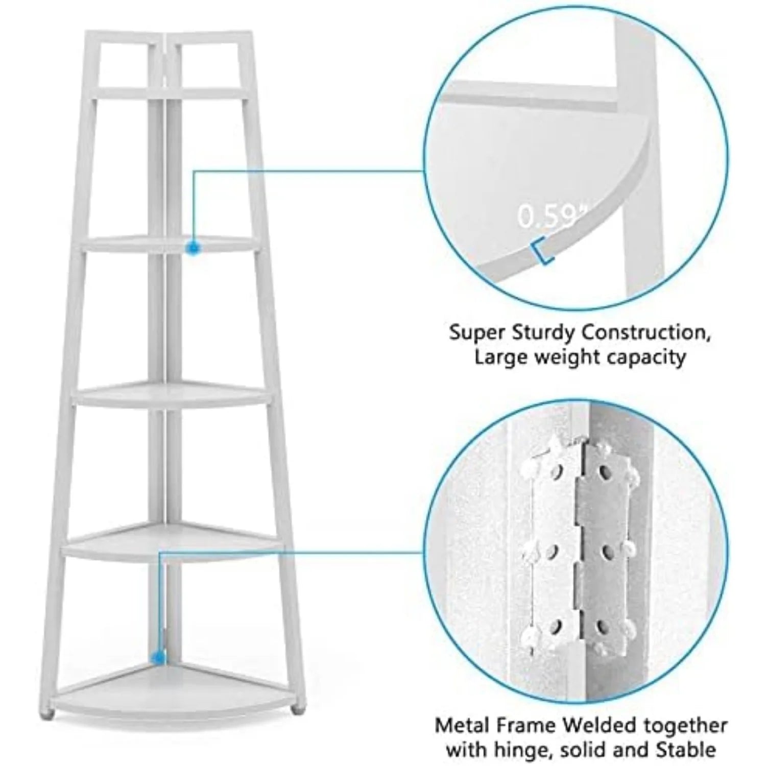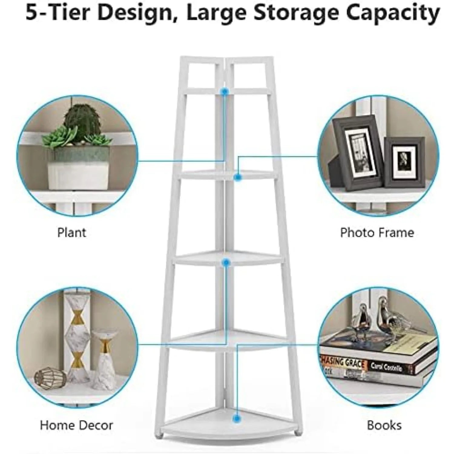 - Maximize corner space with a five-tier design that keeps your books, decor, and essentials neatly organized, freeing up shelf space for display and everyday use.