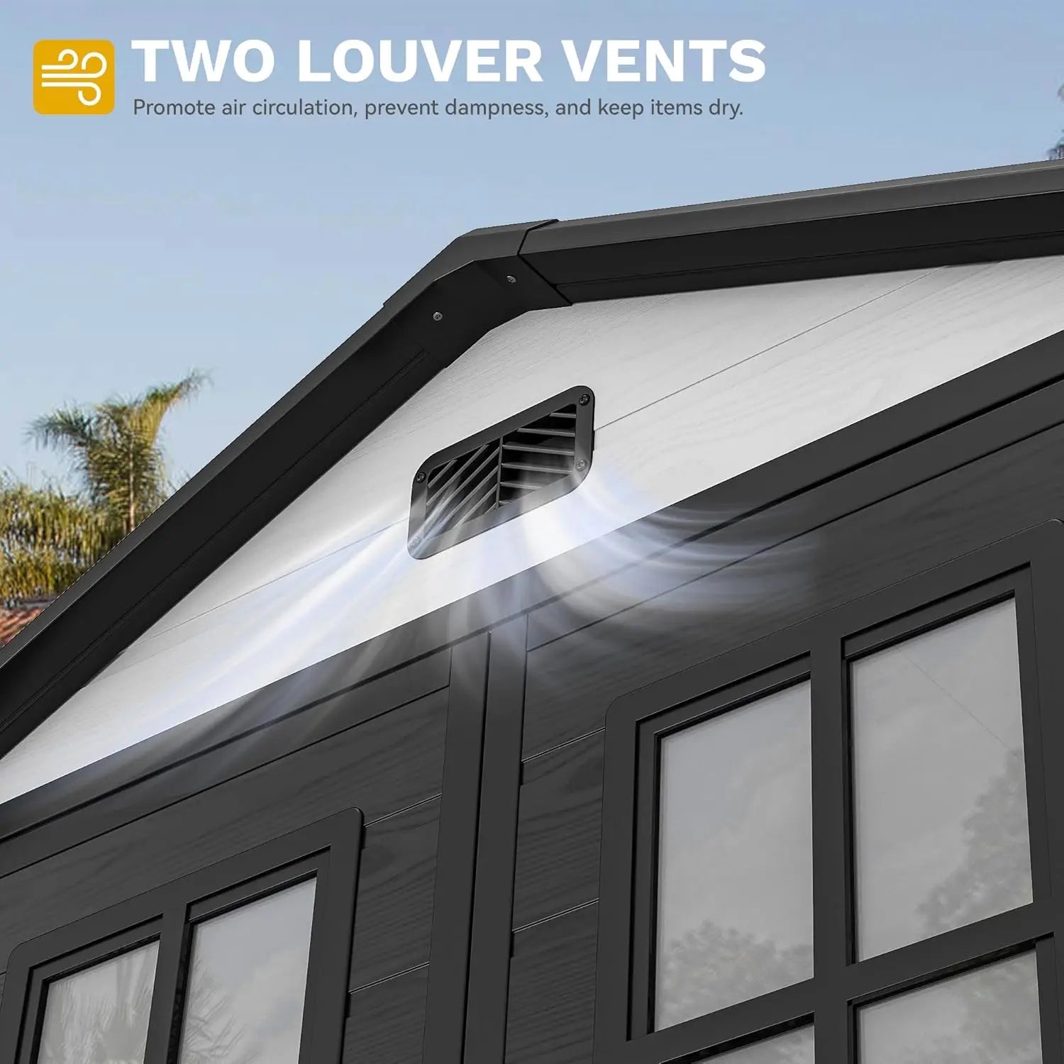 - Bright, secure access featuring two windows for light and ventilation, a lockable door, and a sloped roof for quick rain runoff with easy assembly in two boxes.