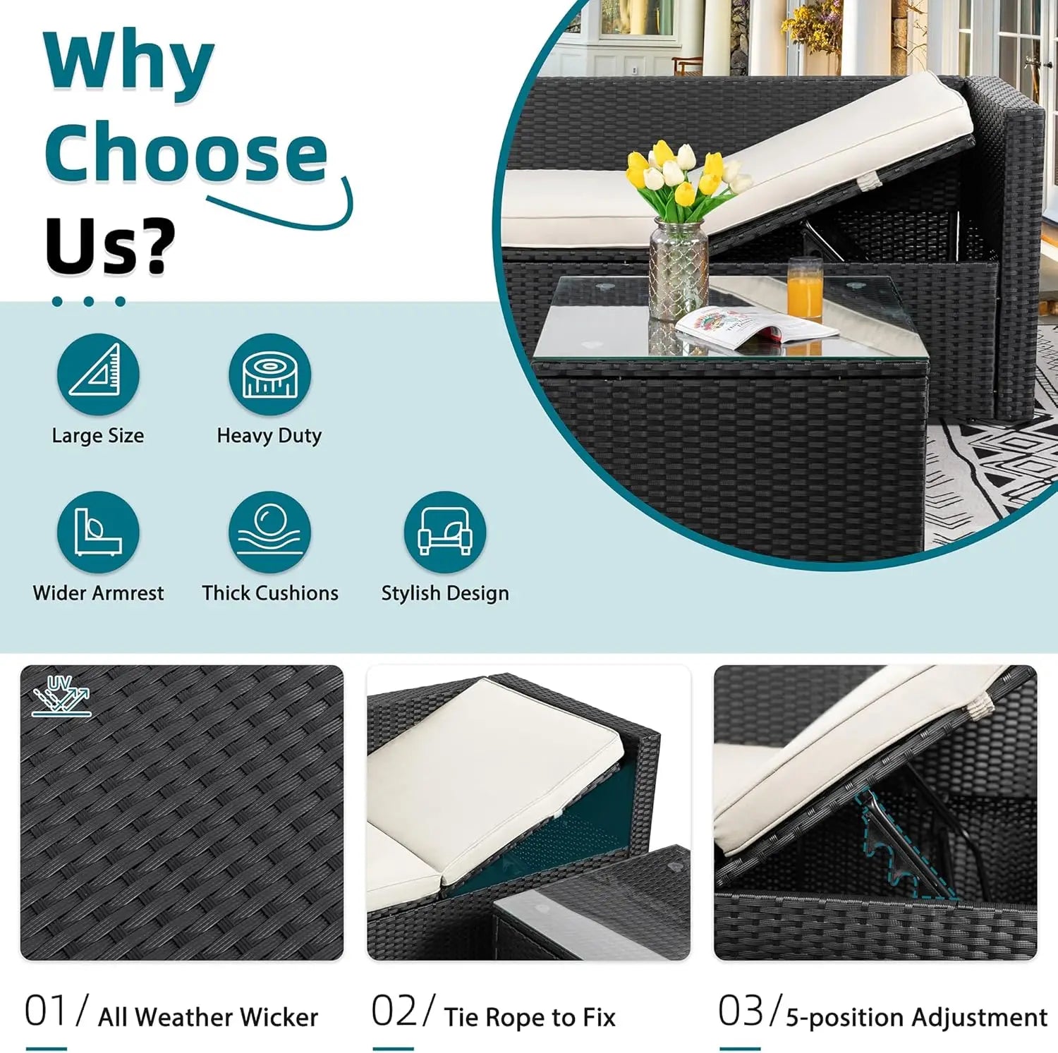 All Weather Outdoor PE Rattan Patio Conversation Sofa Set 3 Piece with Glass Coffee Table Garden Furniture Sets