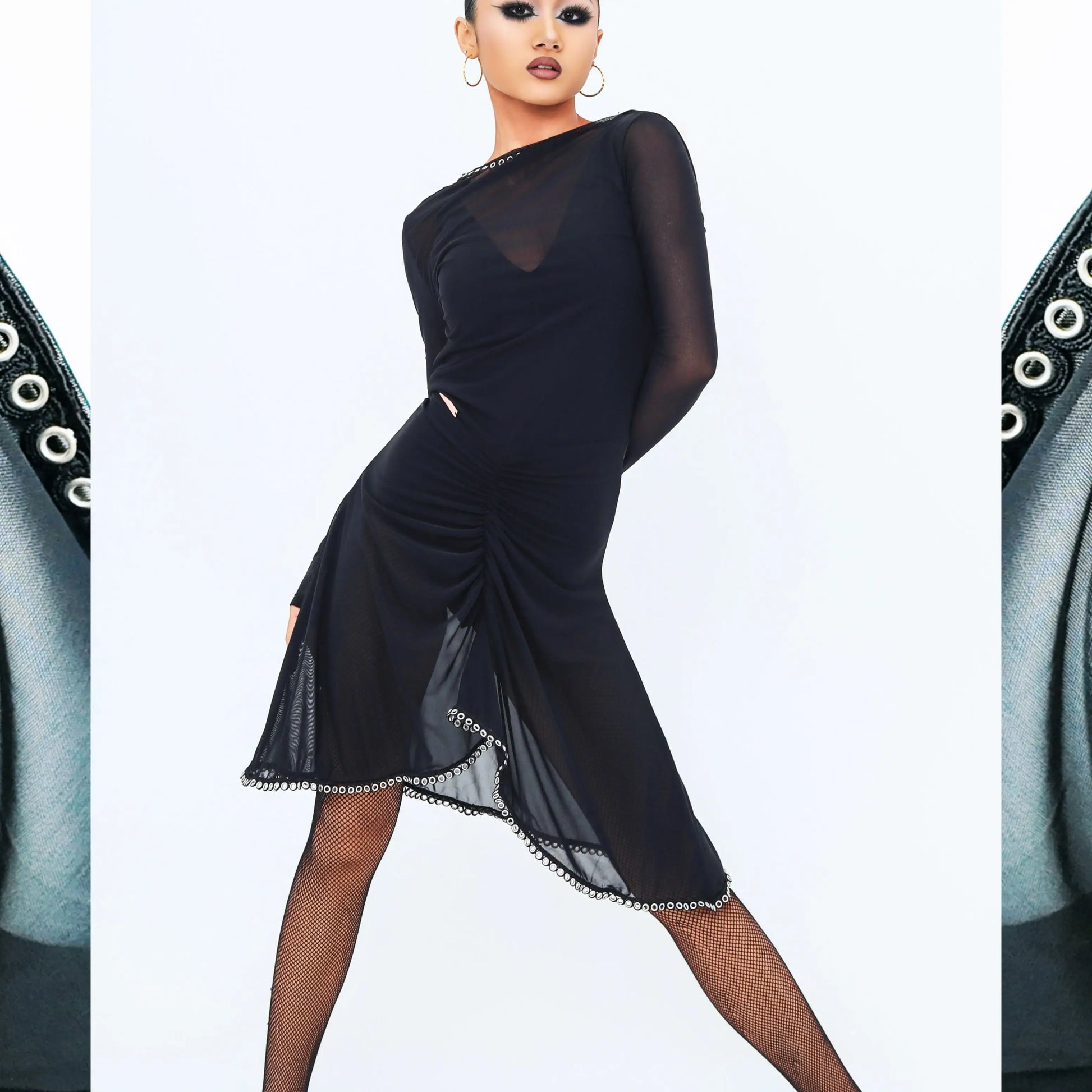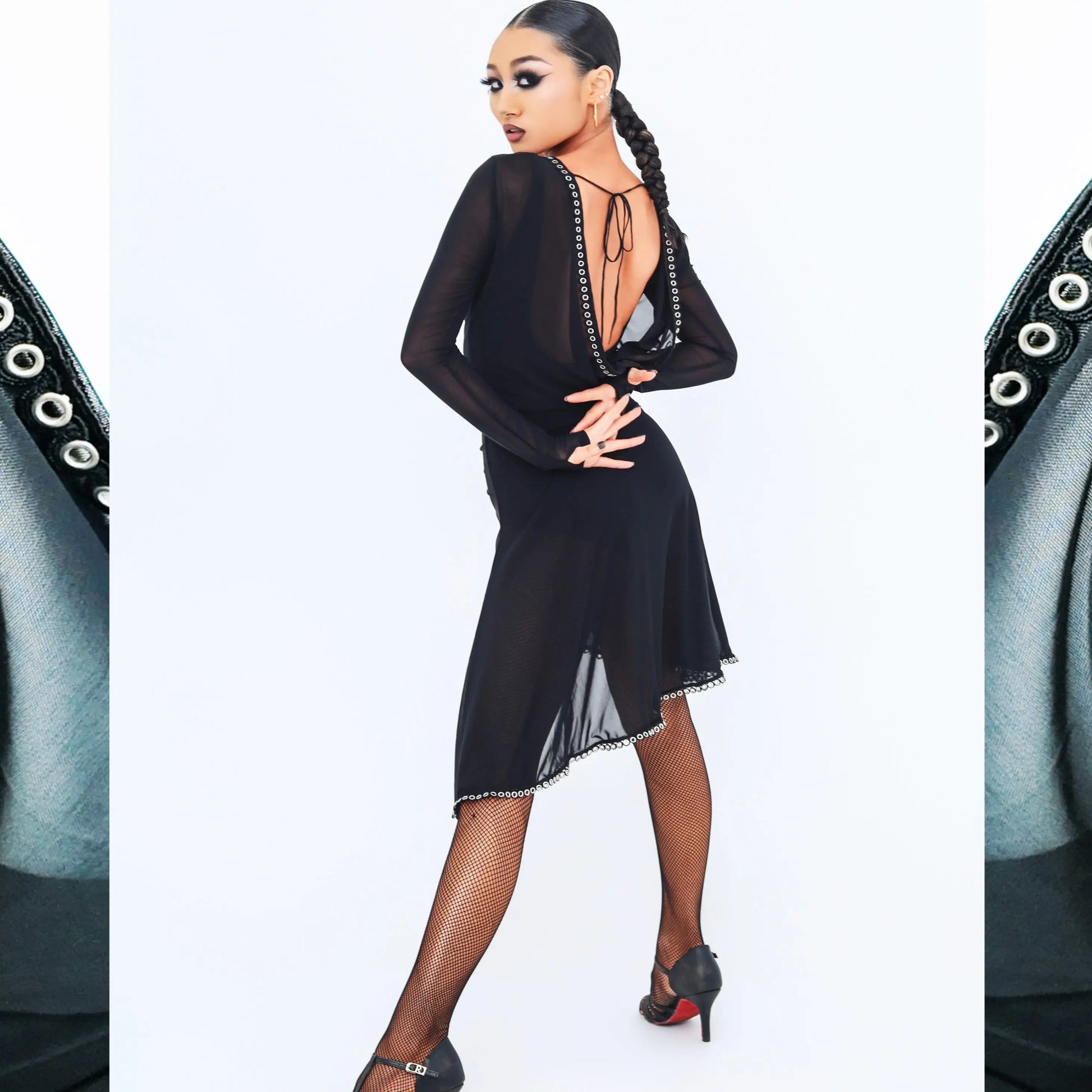 Turn heads on the dance floor with this mesh long-sleeve, backless Latin dance dress designed for performance, practice, and competition.