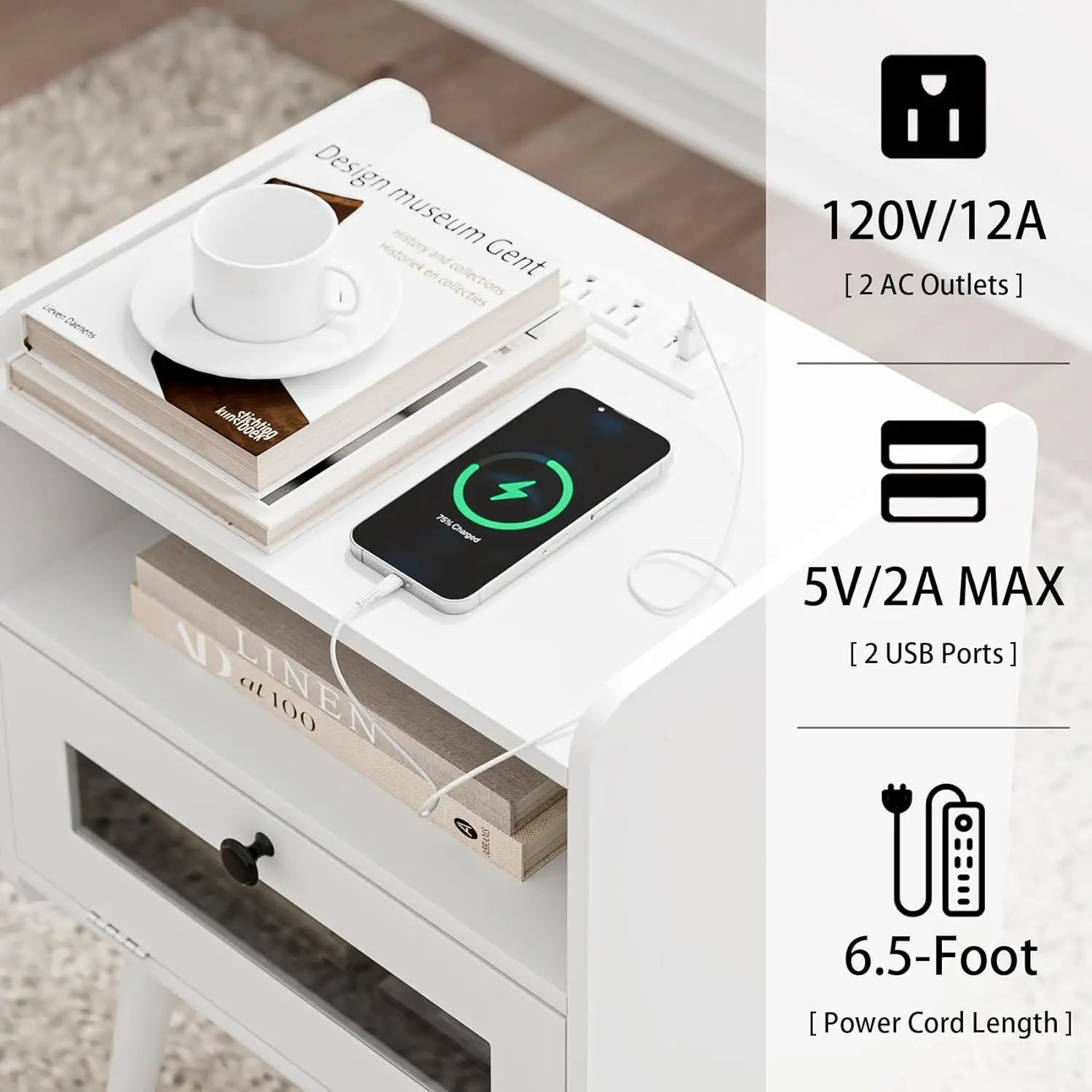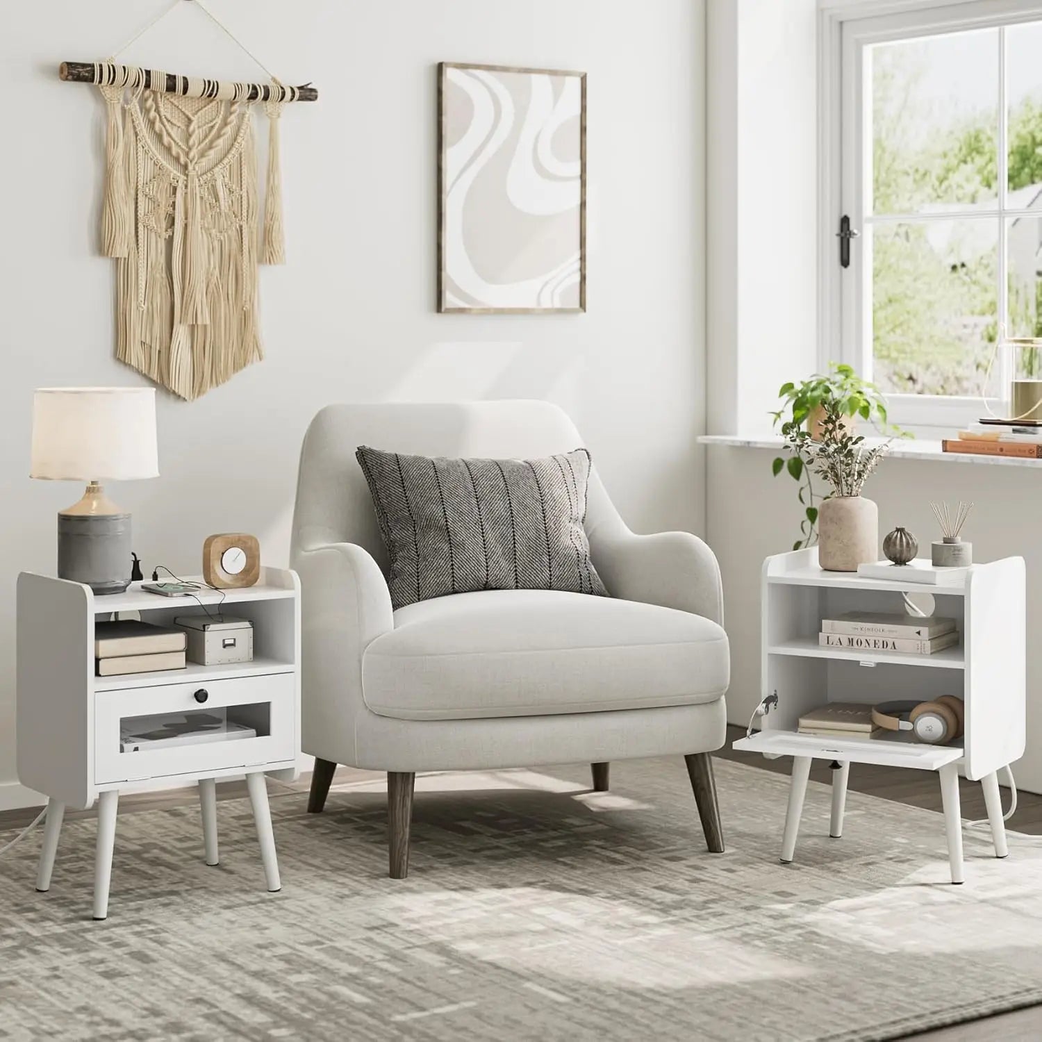 Introducing the Nightstand with Charging Station — a stunning Mid-Century Modern bedside table that perfectly balances style and practicality. This small end side table is designed with a sleek silhouette, making it an ideal addition to any bedroom decor. With its built-in charging station, you can effortlessly keep your devices powered up while enjoying a chic aesthetic.