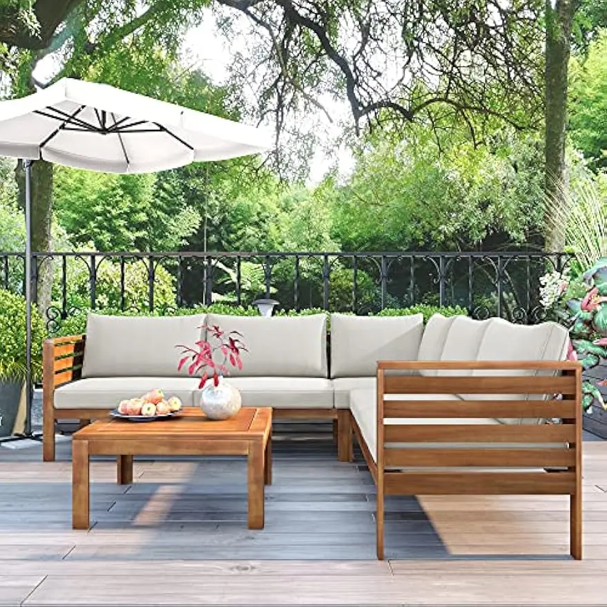 Transform your outdoor space with the luxurious Outdoor Sectional Sofa Set with Coffee Table. This elegant patio sectional seating group features a stunning L-shape design, crafted from premium eucalyptus wood that complements any garden, backyard, or poolside setting. The rich, natural wood finish combined with plush, removable beige cushions provides both style and comfort, creating the perfect spot for relaxation and entertainment.