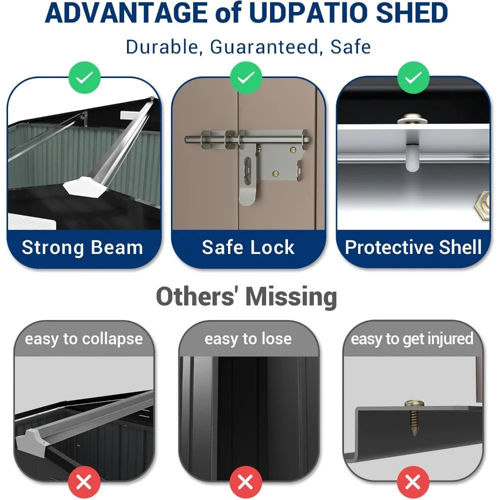 - Easy assembly and a sturdy frame support secure storage year-round, keeping your belongings organized, protected from the elements, and ready whenever you need them.