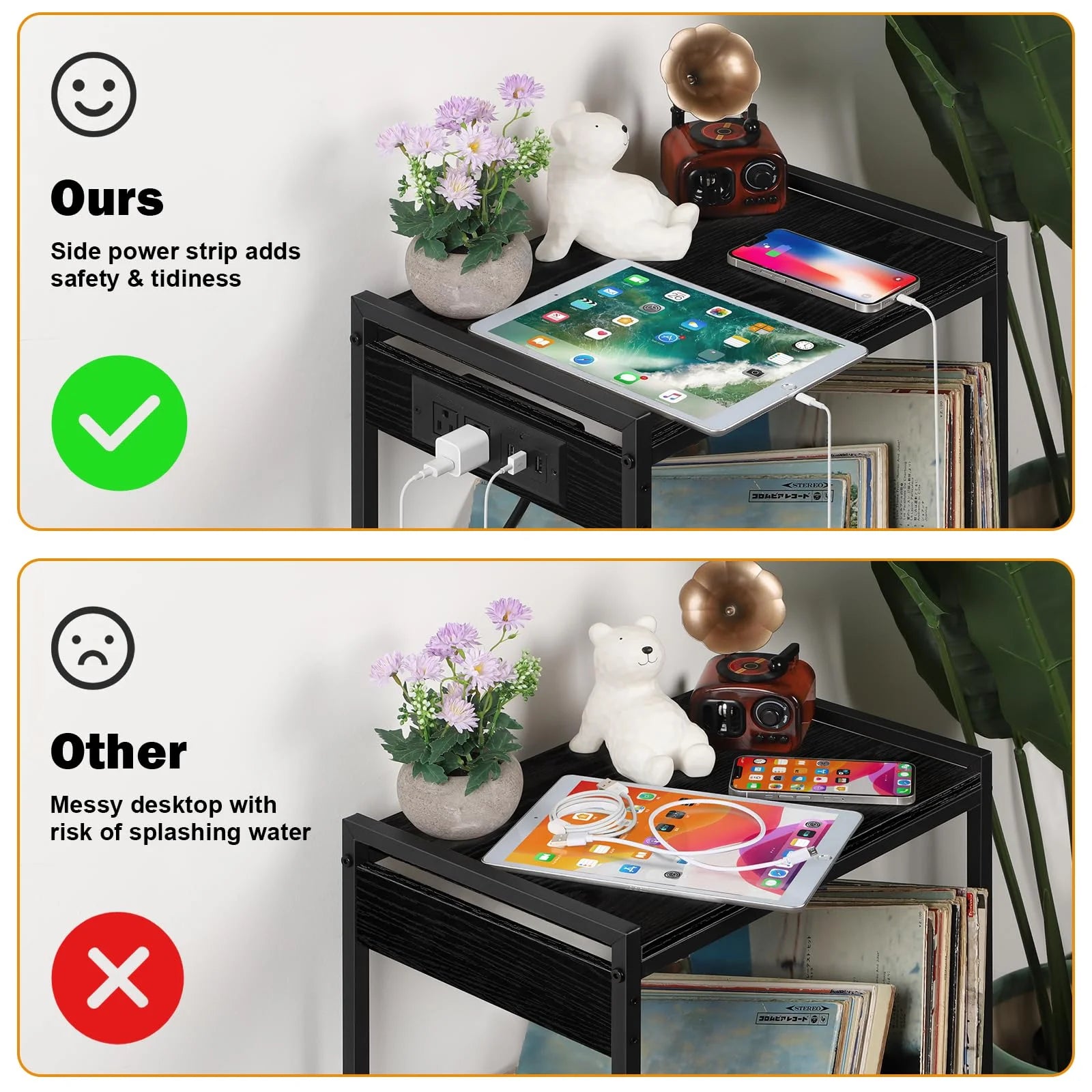 Transform your living space with our Record Player Stand with Vinyl Storage Side Table and Charging Station. This stylish 2-tier rolling record player table is designed for modern homes, providing the perfect blend of functionality and aesthetics. Ideal for showcasing your vinyl collection, it effortlessly enhances any home entertainment area.