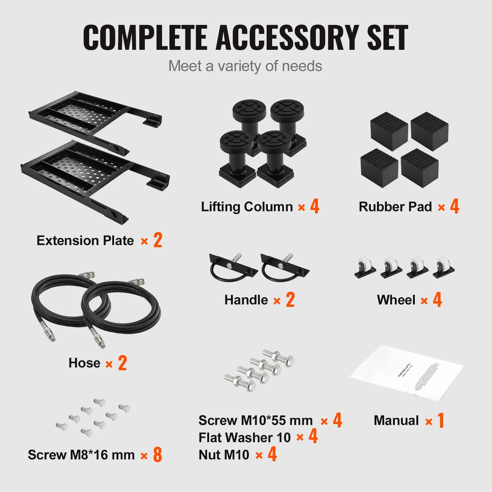 - Four height-adjustable columns lift 9.06" to 25.6" and lifting pads 5.12" to 18.5" for ample under-car clearance.