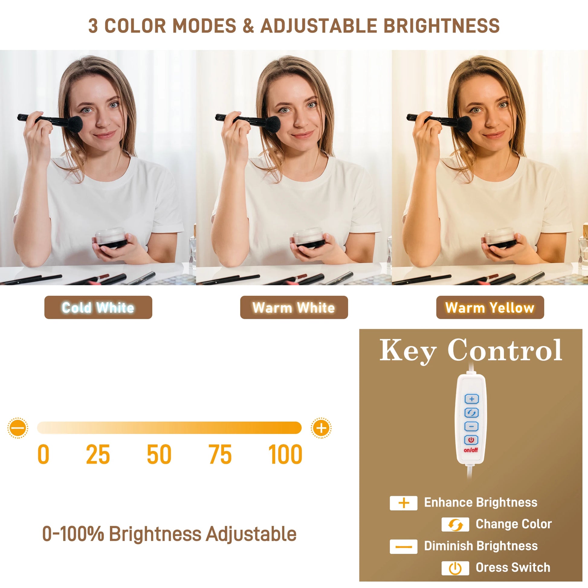 - Built-in LED lighting around the mirror provides flattering, adjustable illumination with long-lasting LEDs and dimming options to ensure flawless makeup application in any lighting.