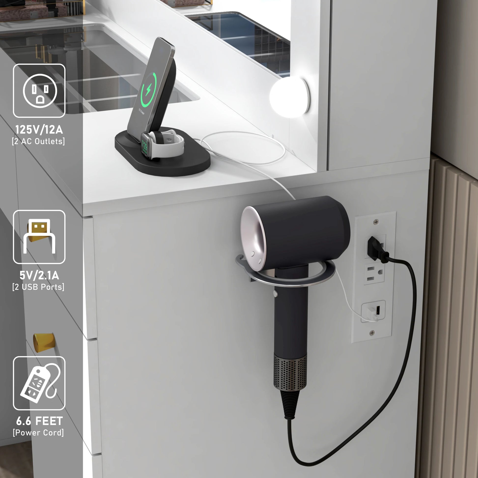 - A built-in power outlet and discreet cord management keep your device chargers, hair tools, and mirror lights within reach for clutter-free grooming.