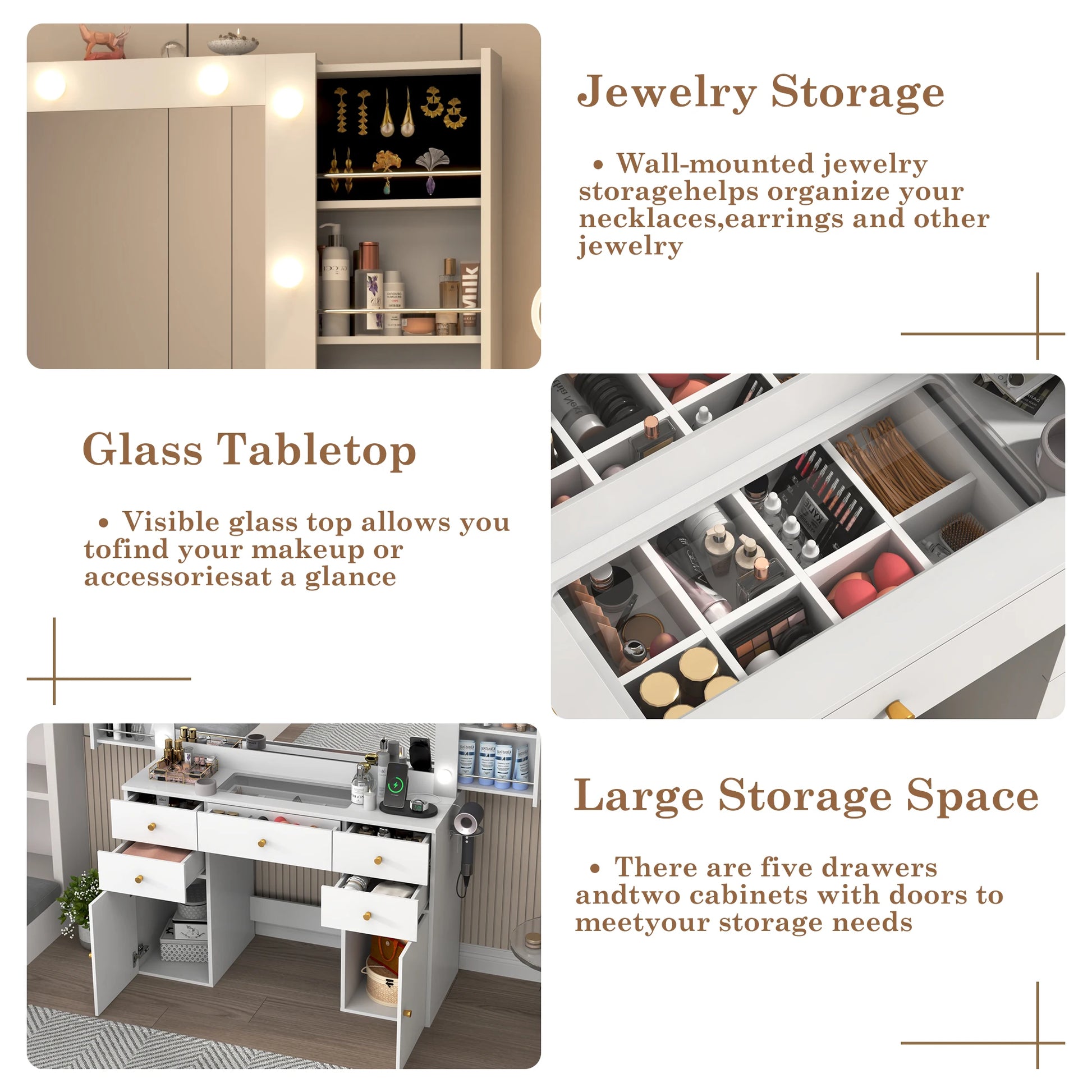- Five spacious drawers offer organized storage for cosmetics, brushes, jewelry, and accessories, with smooth slides to make every routine effortless.
